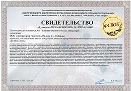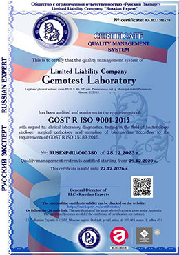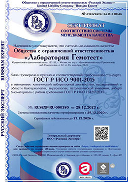 Система менеджмента качества ООО «Лаборатория Гемотест» сертифицирована и соответствует требованиям ГОСТ Р ИСО 9001-2015 с учетом требований ГОСТ Р ИСО 15189-2015.