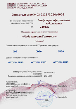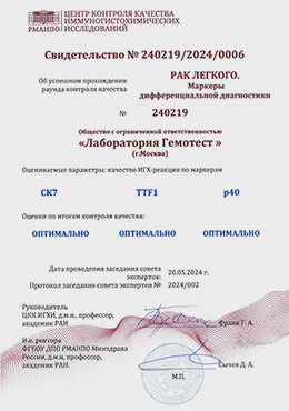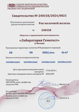 Свидетельство о подтверждении качества Центрa контроля качества иммуногистохимических исследований на базе ФГБОУ ДПО «Российская медицинская академия непрерывного профессионального образования» Министерства здравоохранения Российской Федерации подтверждает успешное прохождение контроля качества всех этапов иммуногистохимических исследований.
